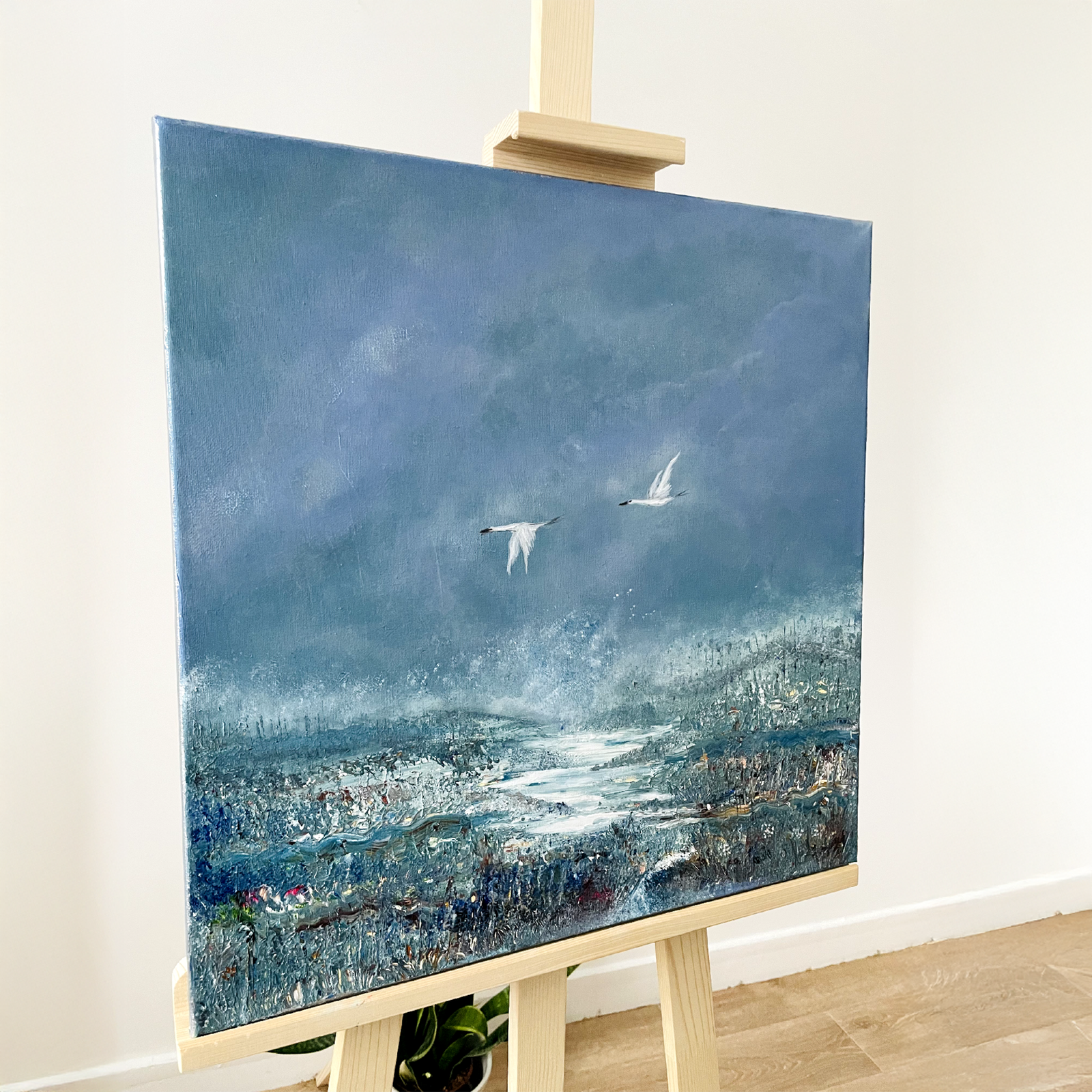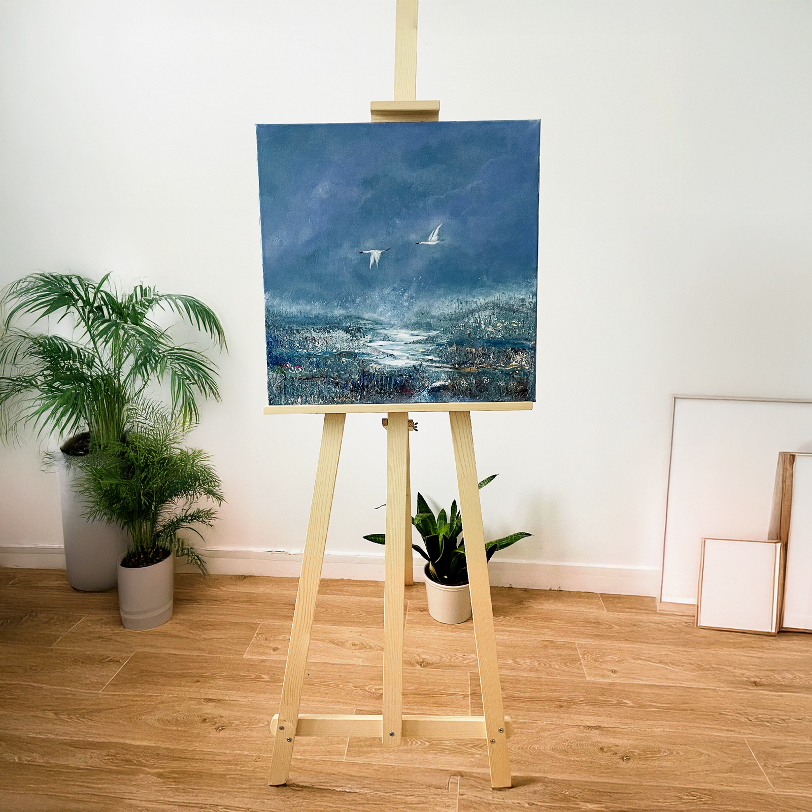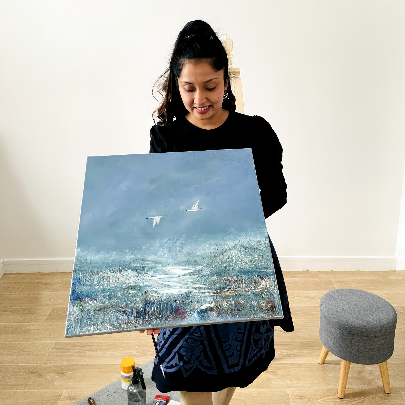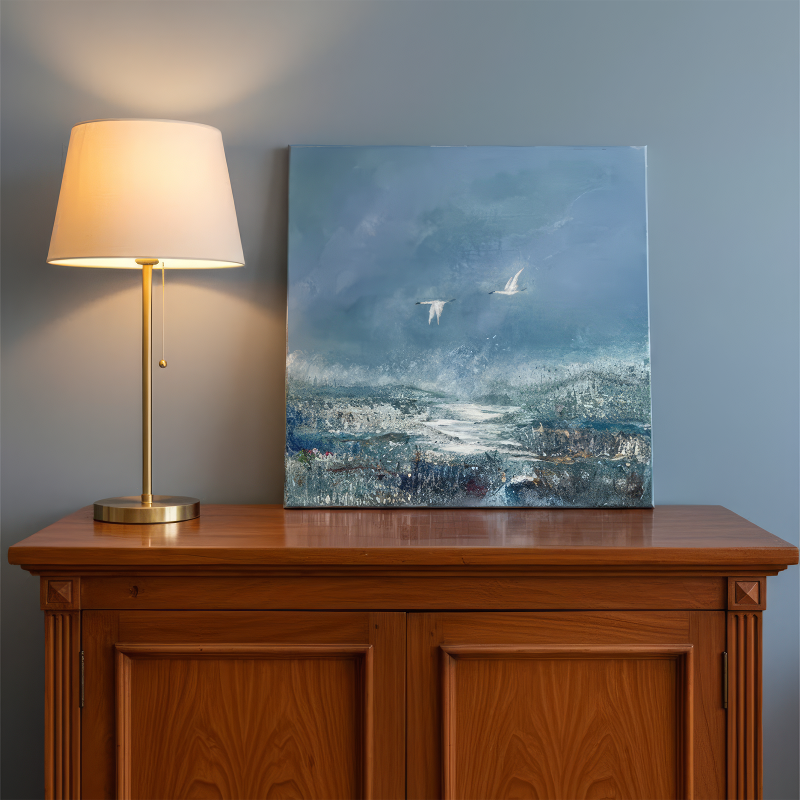 Storm on the Gray Shore is a one-of-a-kind original artwork, hand-painted and signed by Kaushi. Created using Winsor & Newton and Amsterdam acrylic colours, this painting portrays a calm river valley in soft blue tones, with two white swans in flight, evoking a quiet contrast between movement and stillness.