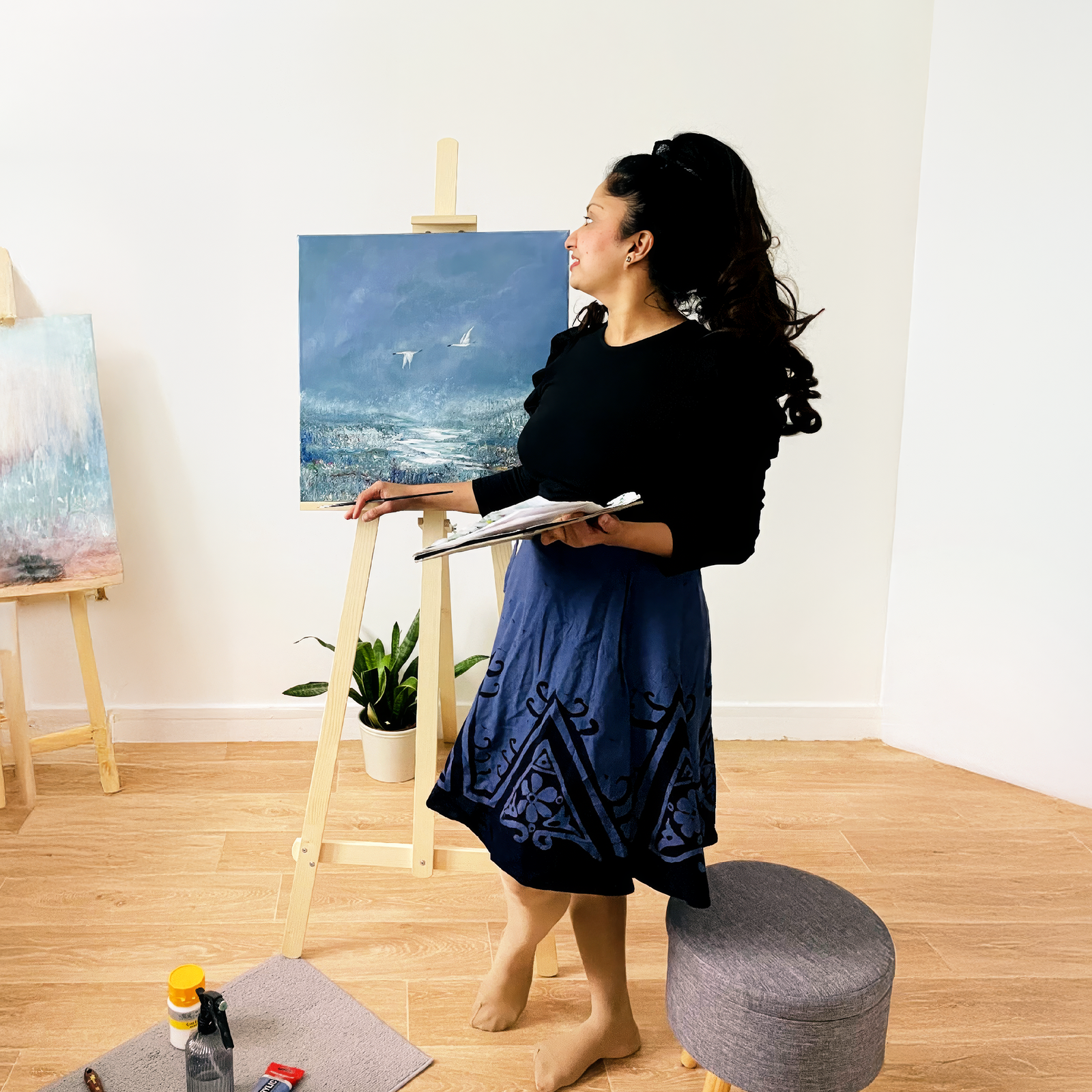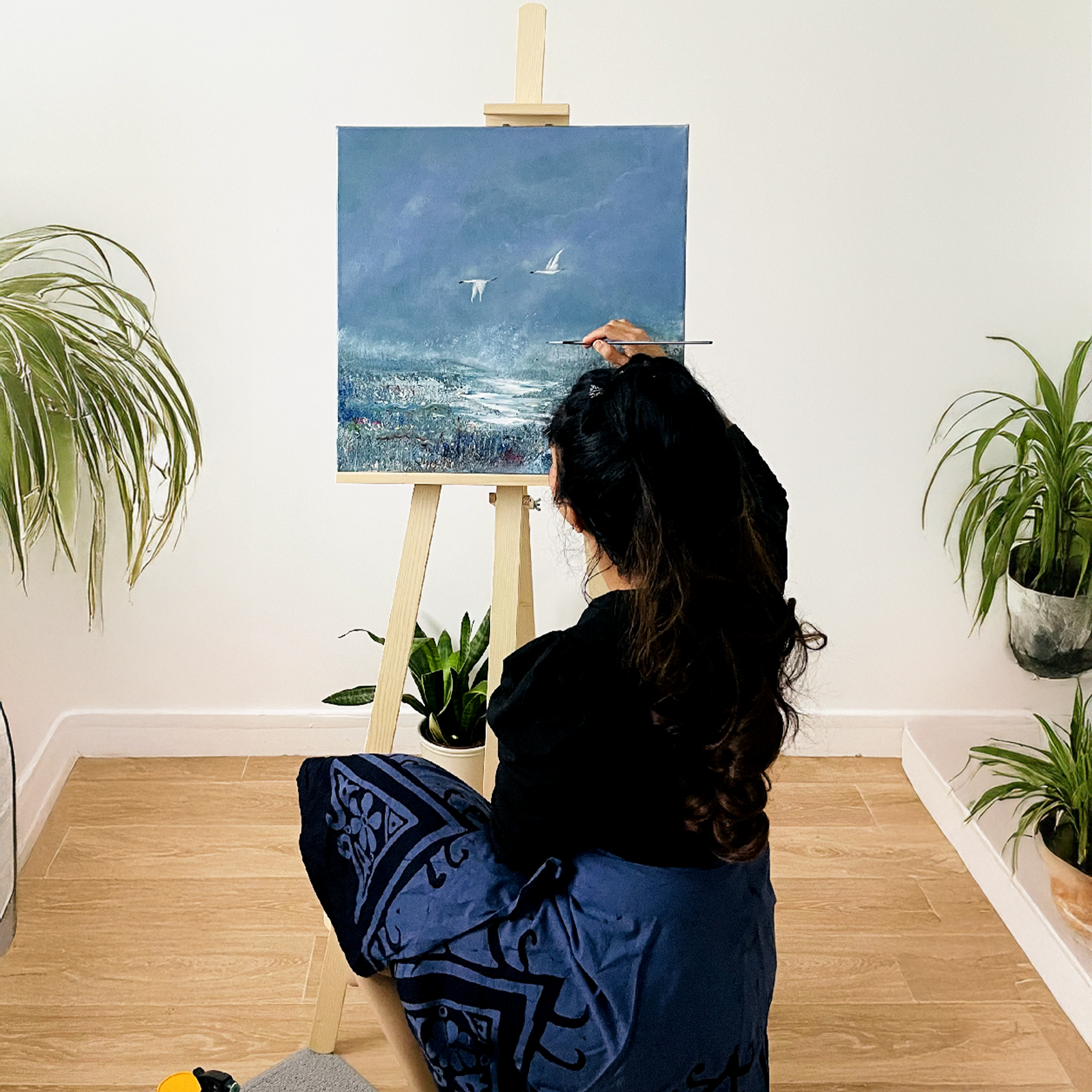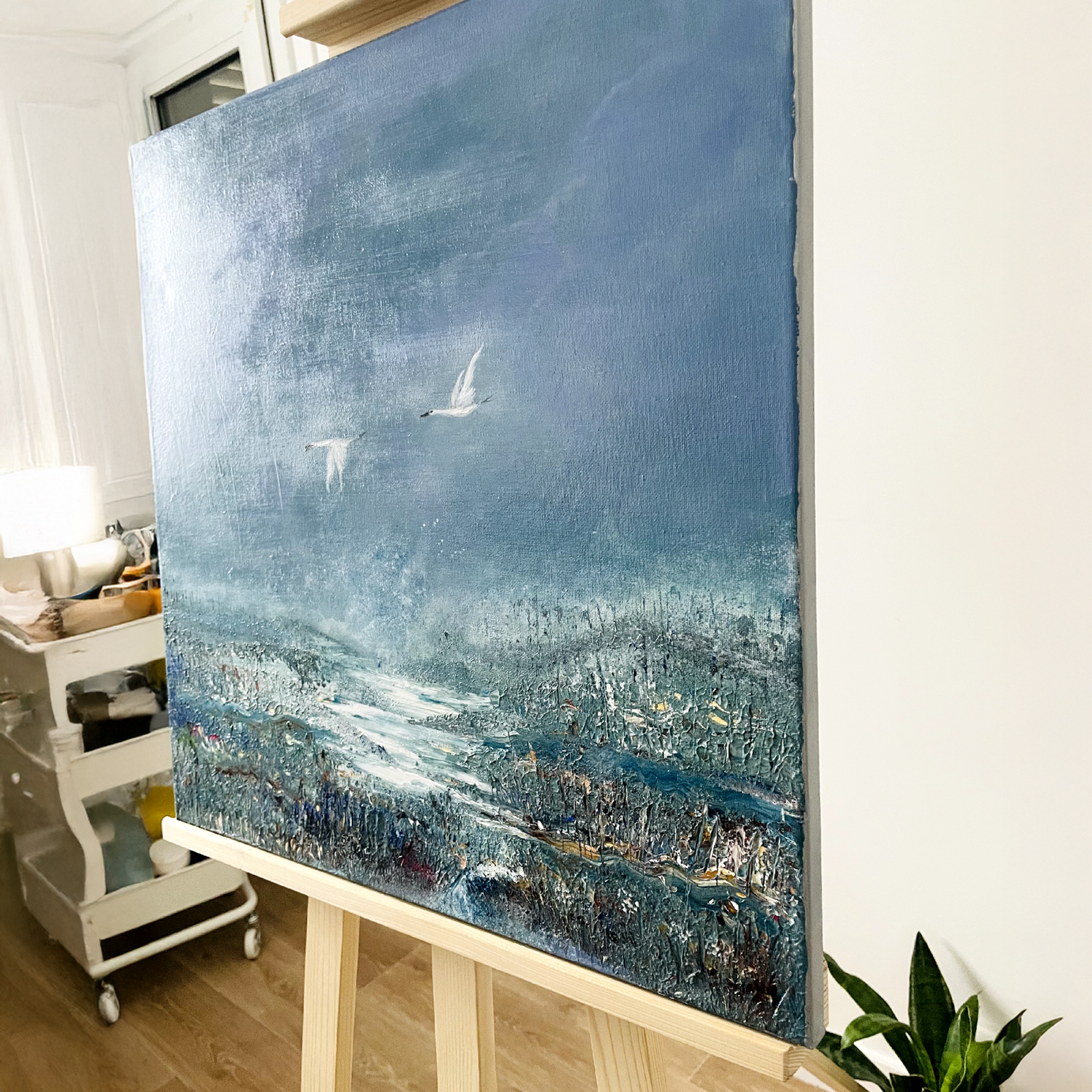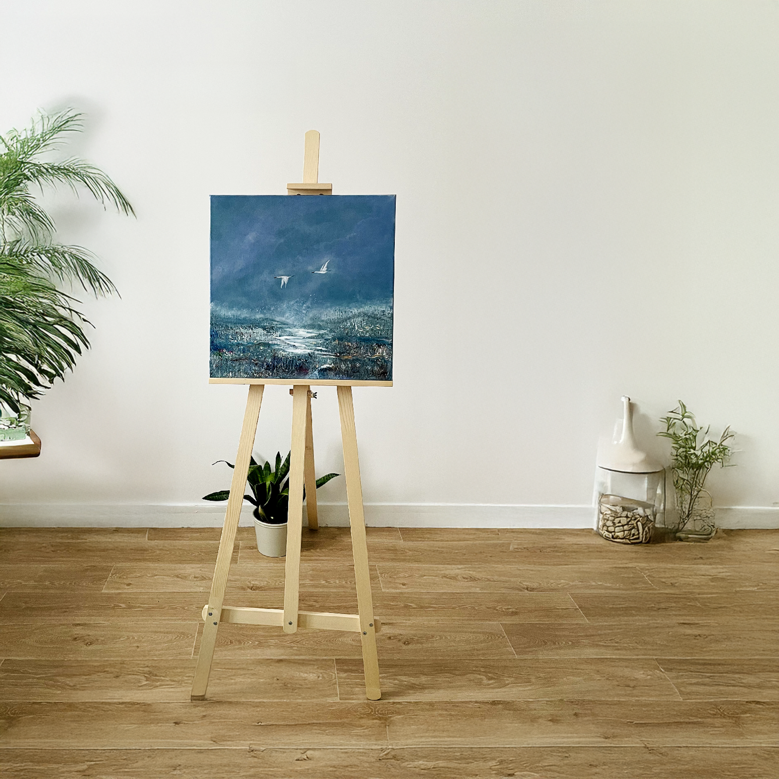 Storm on the Gray Shore is a one-of-a-kind original artwork, hand-painted and signed by Kaushi. Created using Winsor & Newton and Amsterdam acrylic colours, this painting portrays a calm river valley in soft blue tones, with two white swans in flight, evoking a quiet contrast between movement and stillness.